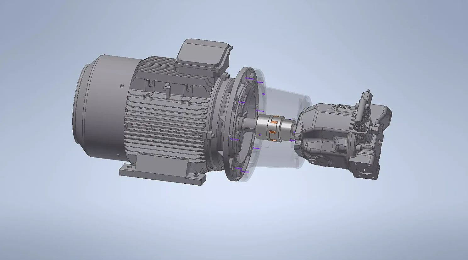 Elmotorer i dessa kommer i 4-poligt utförande, fot/fläns (B35), 400/690V samt med en klassning IE3. Mellanstycke och axelkoppling (stål nav) är av fabrikat KTR.
